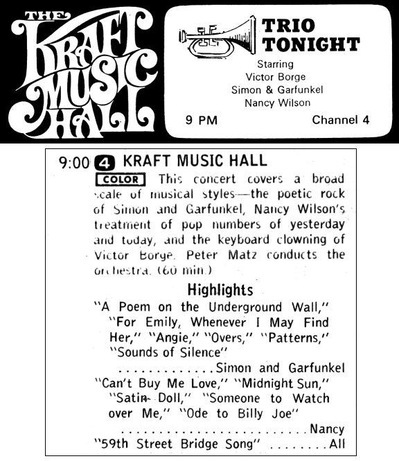 Kraft Music Hall: "Trio For Tonight ," 1/3/68, NBCThis compilation is everything they performed, including the Nancy and Victor finale. Look for younger brother Ed dueting with Paul on "Angie" (@ 8:05) |