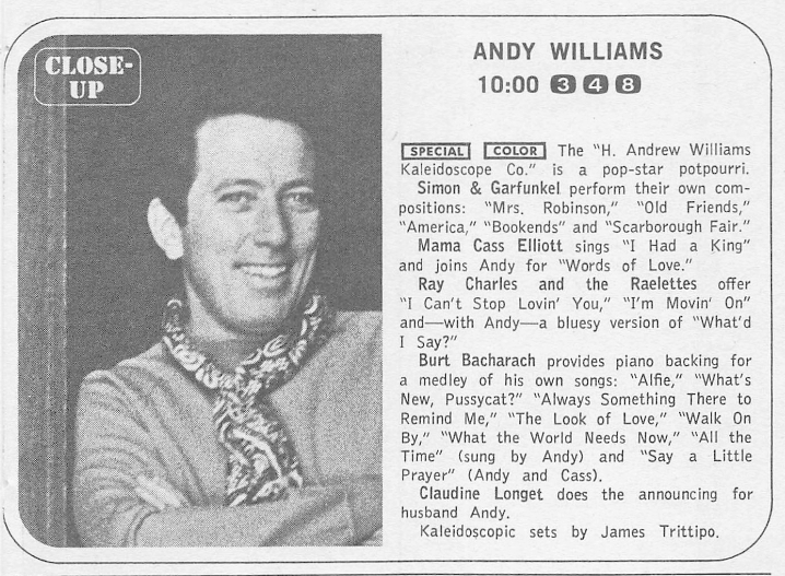Andy Williams Show: "H Andrew Williams Kaleidoscope Co ," 4/28/68, NBCSimon & Garfunkel are one of the guests—Andy joins them for a subtle Scarborough Fair/Canticle. |
